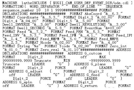 (9)保存退出,在保存文件夾目錄下生成FANUC_0i _D_post.cdl,F(xiàn)ANUC_ 0i _D.pui,F(xiàn)ANUC_0i _D.tcl3個(gè)文件源代碼,圖9所示為生成的部分后置處理源代碼。